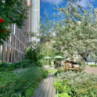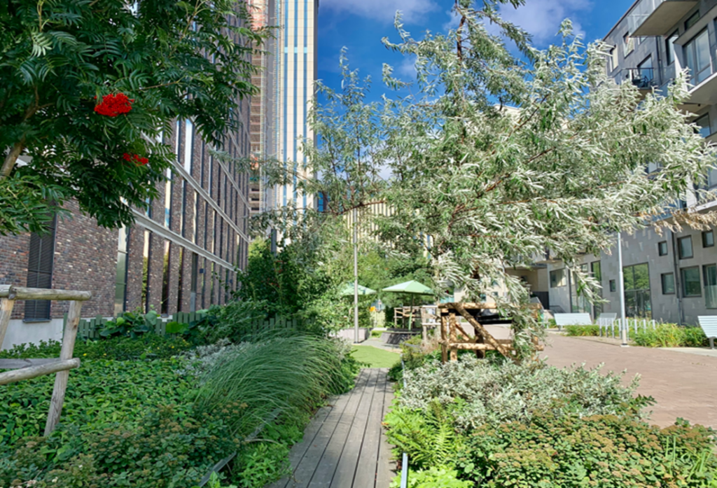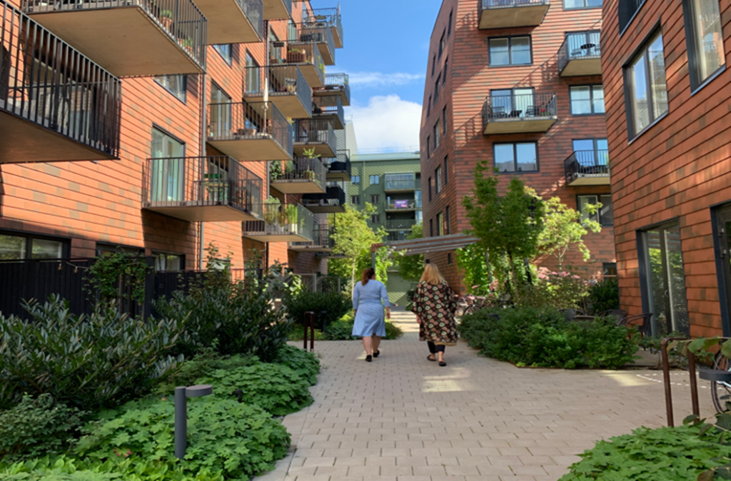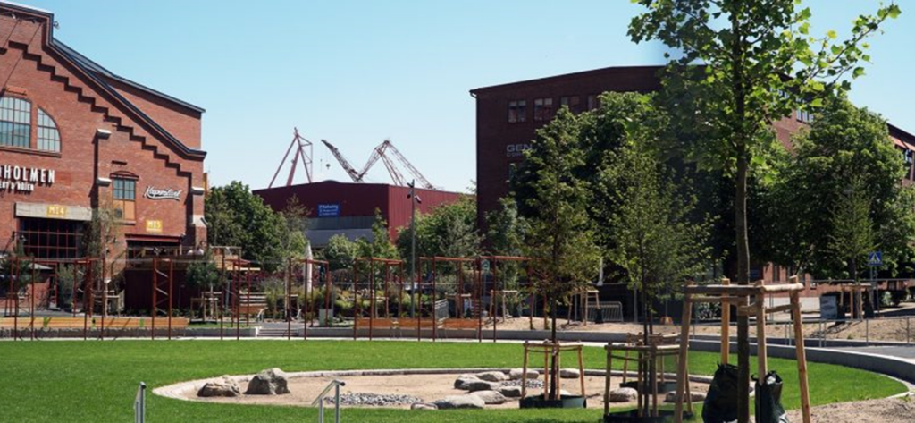 Ett grönt lekstråk som bjuder in till upptäcktsfärd, gröna oaser mellan husen, regnbäddar som fördröjer och renar regnvatten med planteringar, offentlig konst, förskola, verksamheter så som butiker, restauranger och gym som skapar liv på kvällar och helger. Det är en liten del av vad området kan erbjuda idag. Och mer liv ska det bli. Närmast vattnet pågår sedan 2023 den stora byggnationen av bryggdäck med restaurang och torgyta där markytan förlängs ut i älven.