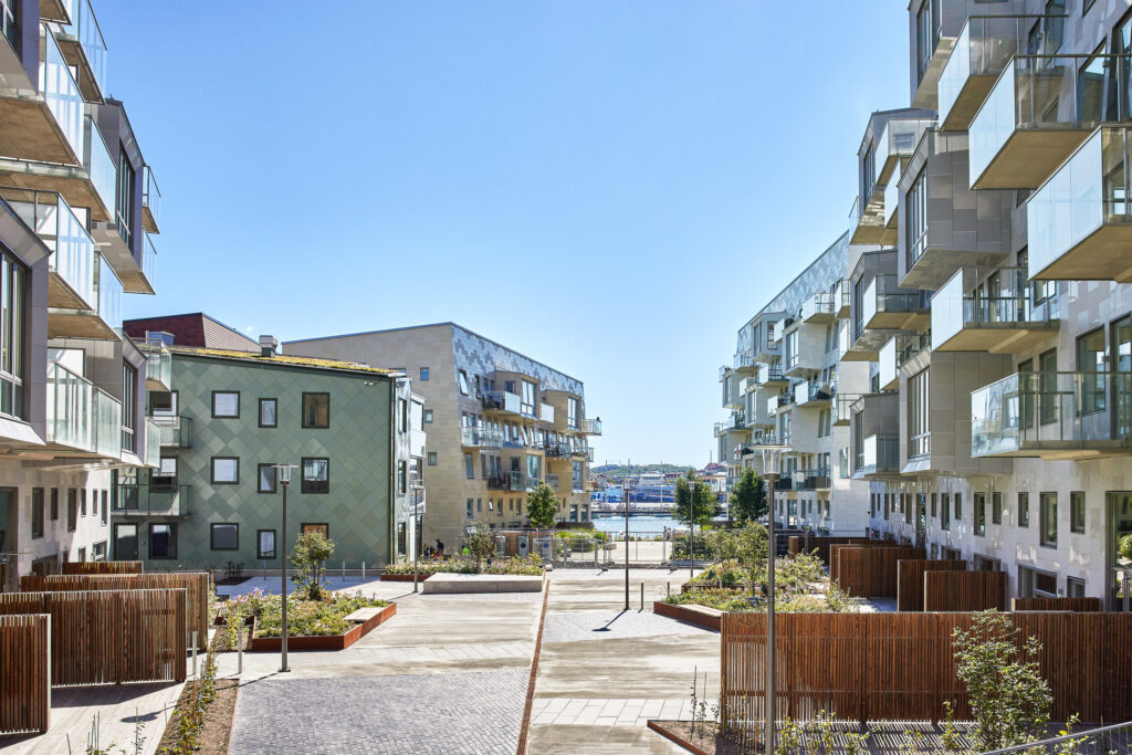 Byggherrarna och förvaltningarna har jobbat gemensamt och haft höga ambitioner med hållbarhet och gestaltning. Området ska ge ett sammanhållet intryck där varje huskropp ska uppfattas som en monolit, som stenar som fallit från himlen. Husen har lutande fasader, jordnära kulörer, fasader klädda med shingelteknik och tydliga riktlinjer vad gäller placering av exempelvis stuprör och fönster.